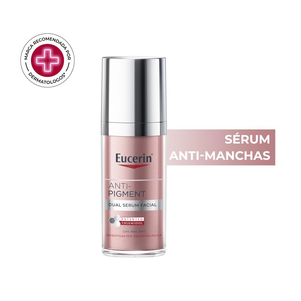 El Sérum El Sérum facial Eucerin ANTI-PIGMENT de doble acción contiene dos componentes principales: Thiamidol, un ingrediente eficaz que actúa en la raíz de la causa de la hiperpigmentación, previniendo su reaparición al usarlo de modo regular; y Ácido Hialurónico concentrado como una de las sustancias humectantes que ayuda a que la piel conserve y atraiga la humedad. La emulsión reduce las manchas y renueva la apariencia de la piel, logrando que luzca suave, radiante y homogénea. Los primeros resultados son visibles después de dos semanas y es apto para todo tipo de piel.