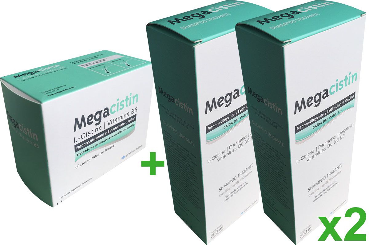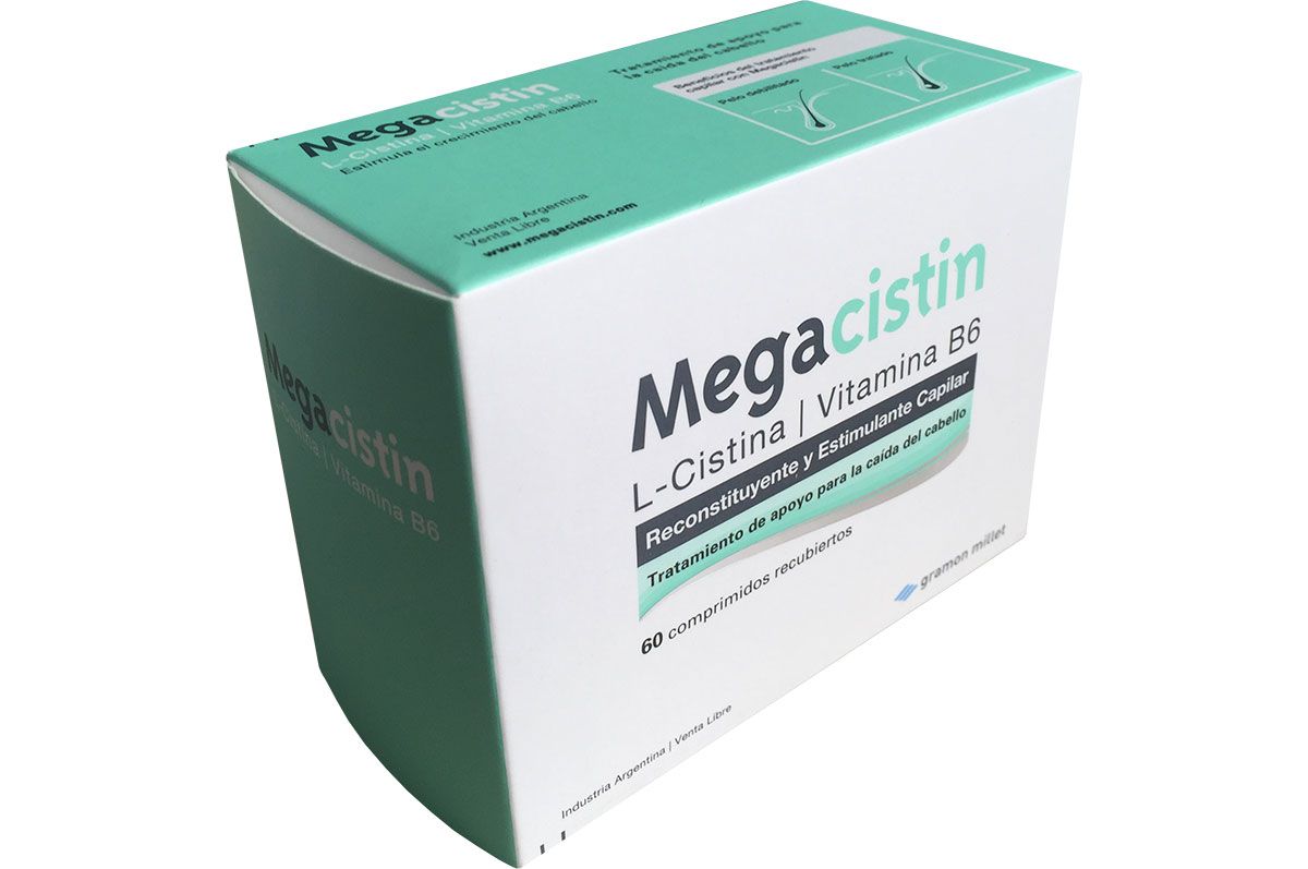 Dos comprimidos de Megacistin contienen la cantidad de L-Cistina necesaria para reactivar el ciclo del crecimiento del cabello. Tomando todos los días dos comprimidos de Megacistin, se activa el proceso de regeneración en los folículos pilosos y el cabello vuelve a crecer sano y vital. Megacistin es la solución ideal al problema de la caída del cabello. Actúa desde el interior supliendo la falta del aminoácido esencial para que crezca con normalidad.