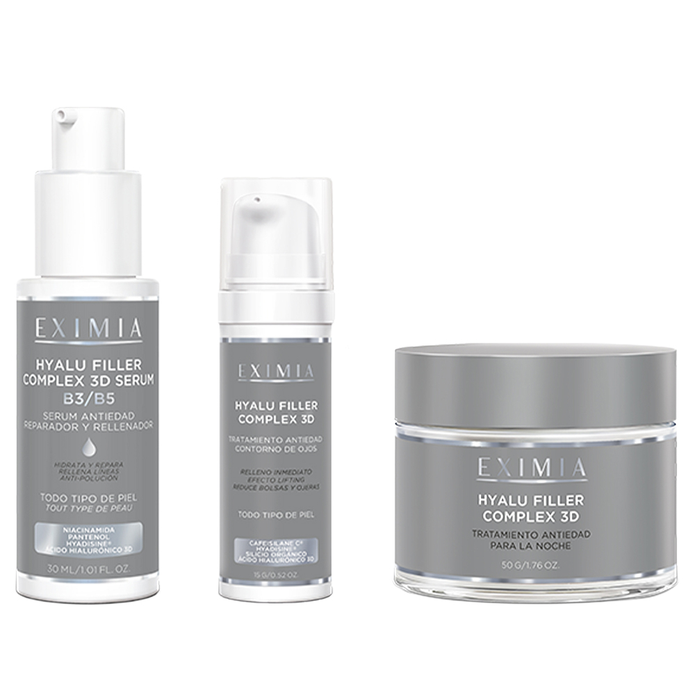La rutina facial Eximia Hyalu Filler Complex 3D está diseñada para combatir los signos del envejecimiento desde el primer momento. Consta de tres productos complementarios: sérum facial, contorno de ojos y crema de noche. Su combinación de ácido hialurónico de última generación, silicio orgánico y activos antioxidantes actúa en sinergia para hidratar, rellenar arrugas, reafirmar y revitalizar la piel, ofreciendo resultados visibles en poco tiempo.
