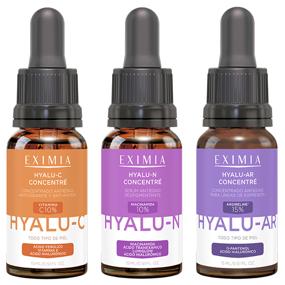 Este combo potente reúne tres serums de la línea Eximia Hyalu para una rutina antiedad completa: Hyalu‑C Concentré (antioxidante iluminador), Hyalu‑AR Concentré (relajante de líneas de expresión) y Hyalu‑N Concentré (despigmentante intensivo). La sinergia de sus fórmulas permite iluminar el tono, suavizar arrugas y atenuar manchas, ofreciendo una piel más uniforme, tersa y rejuvenecida desde los primeros usos. Todo en texturas ligeras, aptas para todo tipo de pieles y clínicamente testadas.