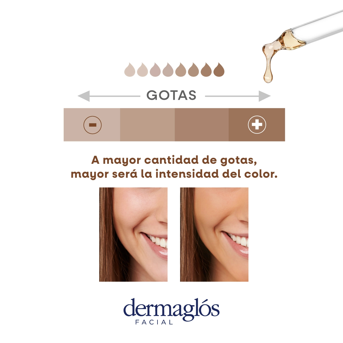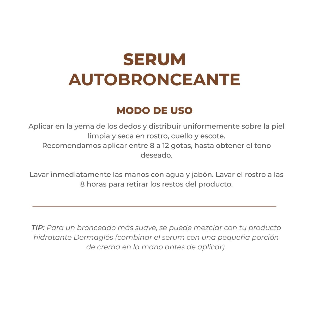 Se recomienda aplicar el serum autobronceante con la yema de los dedos sobre la piel limpia y seca del rostro, cuello y escote. Utilizar entre 8 y 12 gotas, según la intensidad deseada. Para un resultado más suave, mezclar el serum con la crema hidratante Dermaglós directamente en la mano antes de aplicarlo. Retirar del rostro a las 8 horas para mantener un color uniforme y natural.