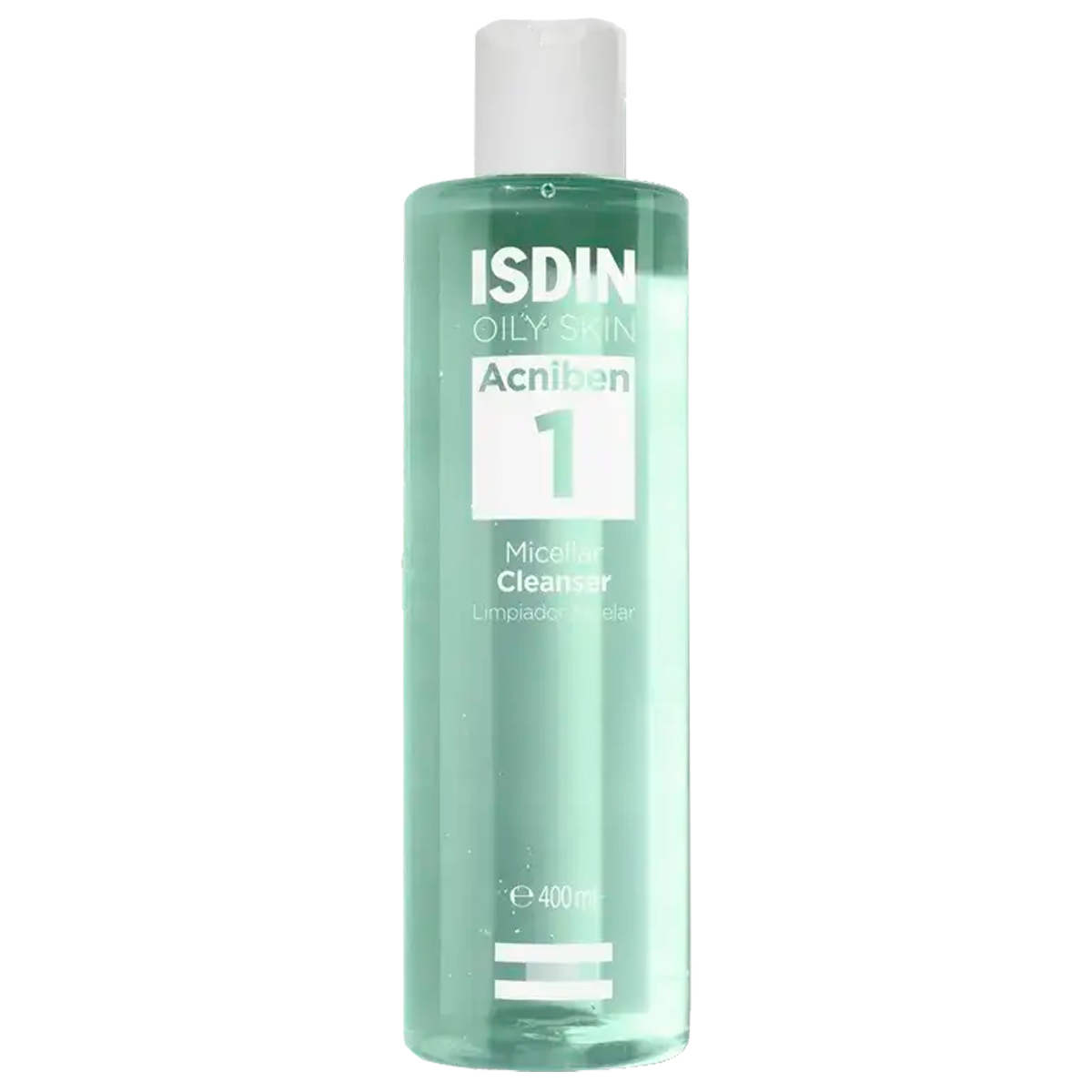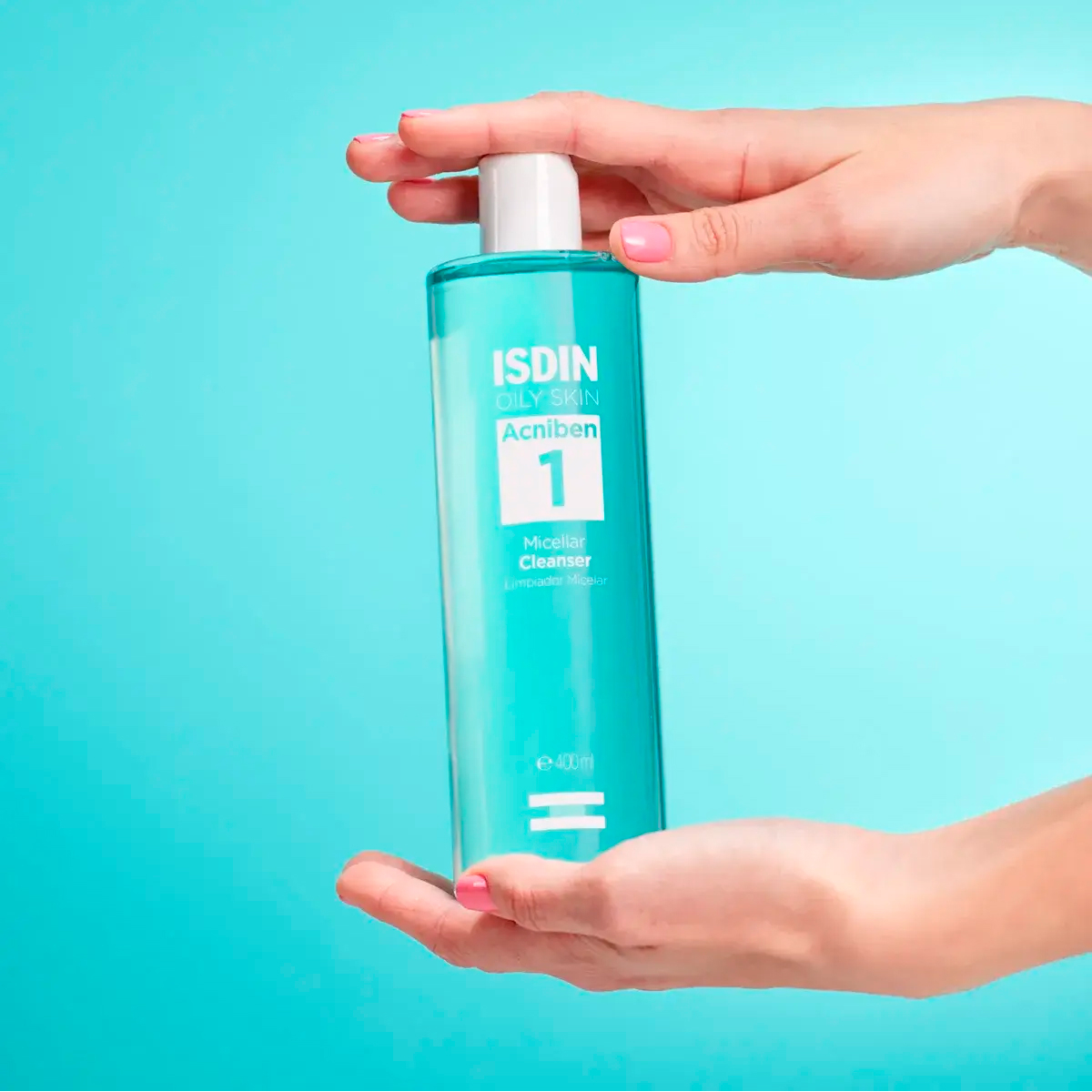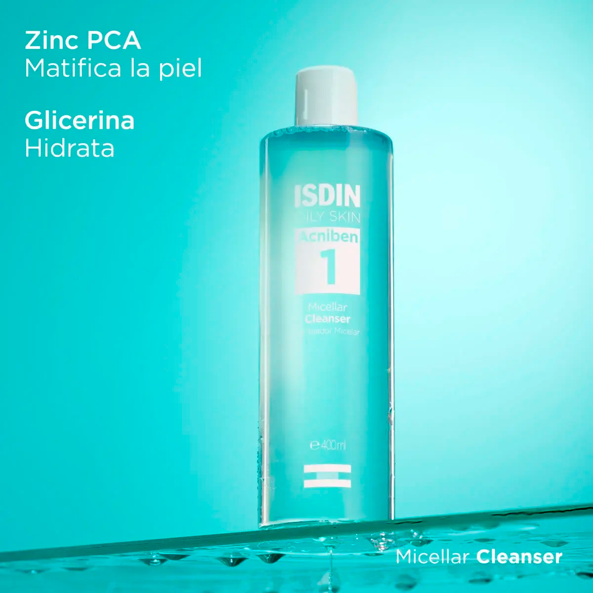 Isdin Acniben Micellar Cleanser es un limpiador facial micelar desarrollado especialmente para la piel grasa o con tendencia acneica. Elimina impurezas, maquillaje (incluso waterproof) y exceso de sebo en un solo paso, sin necesidad de enjuague. Su fórmula con tecnología micelar limpia suavemente, dejando la piel matificada, fresca y libre de brillos sin resecar ni alterar la barrera cutánea.
