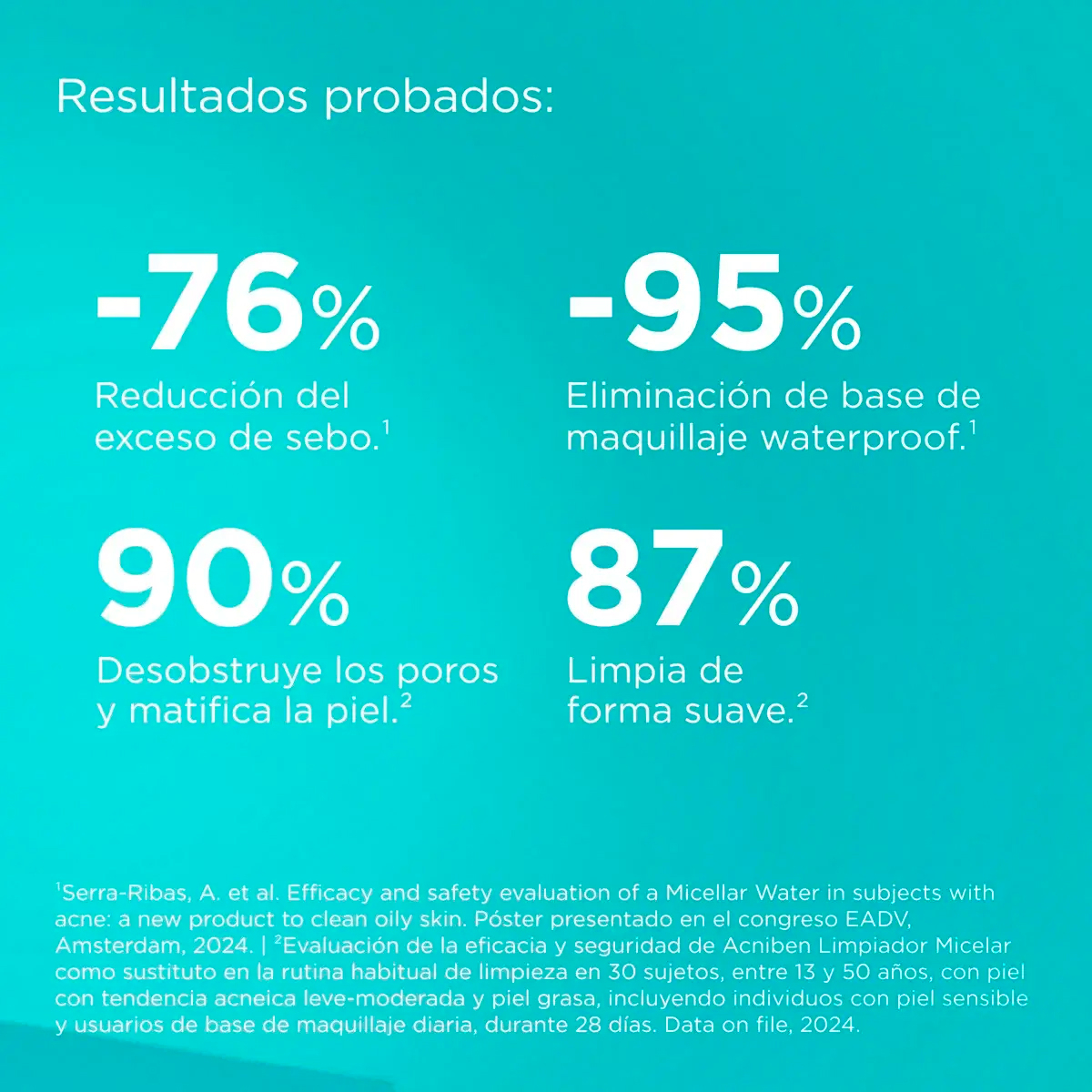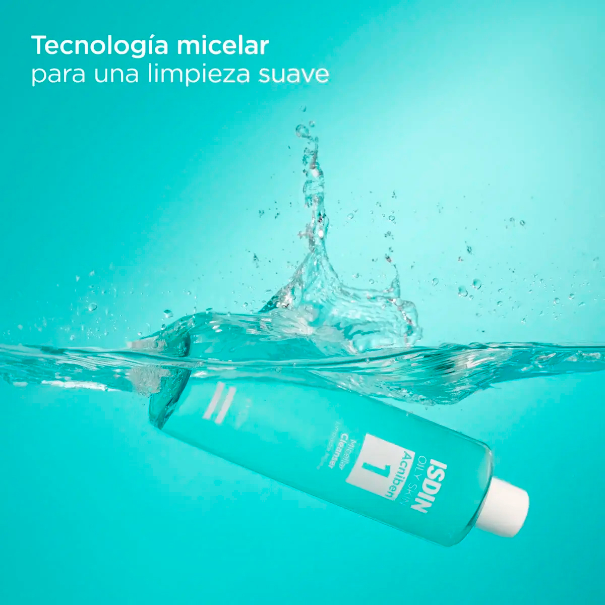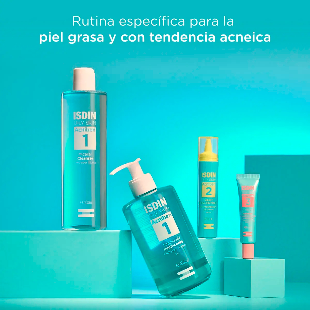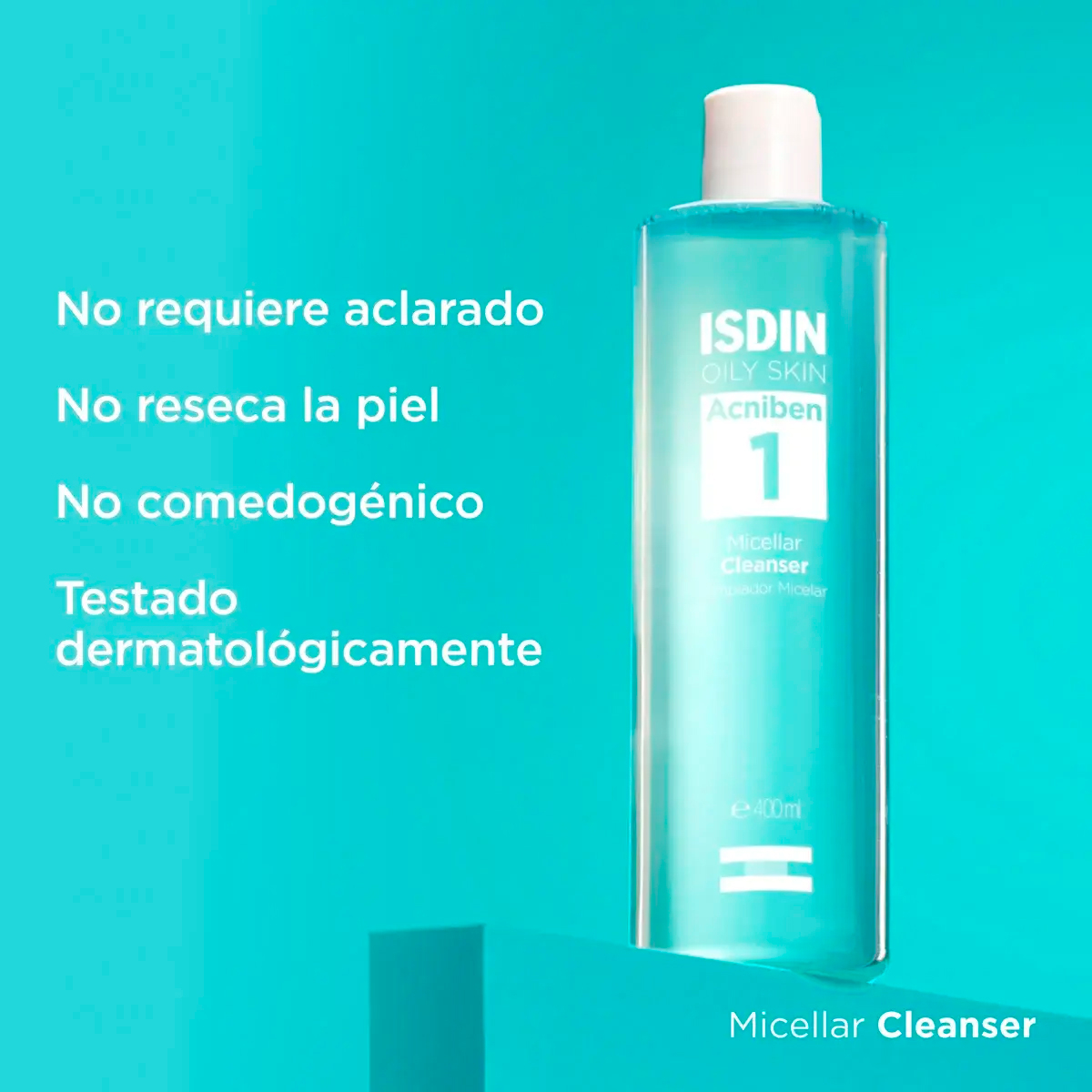 Isdin Acniben Micellar Cleanser es un limpiador facial micelar desarrollado especialmente para la piel grasa o con tendencia acneica. Elimina impurezas, maquillaje (incluso waterproof) y exceso de sebo en un solo paso, sin necesidad de enjuague. Su fórmula con tecnología micelar limpia suavemente, dejando la piel matificada, fresca y libre de brillos sin resecar ni alterar la barrera cutánea.