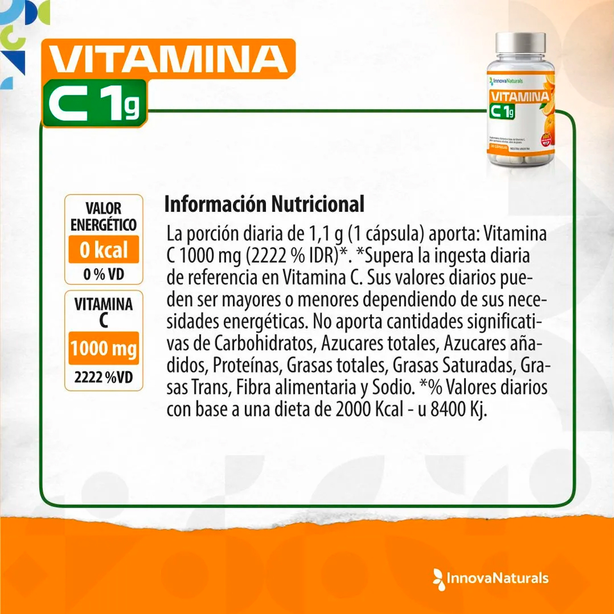 Innovanaturals Vitamina C 1000 mg es un suplemento dietario especialmente formulado para fortalecer el sistema inmunológico, mejorar la salud de la piel y colaborar en la absorción de nutrientes esenciales. Su presentación en cápsulas facilita su ingesta diaria y asegura una alta biodisponibilidad de la vitamina.
