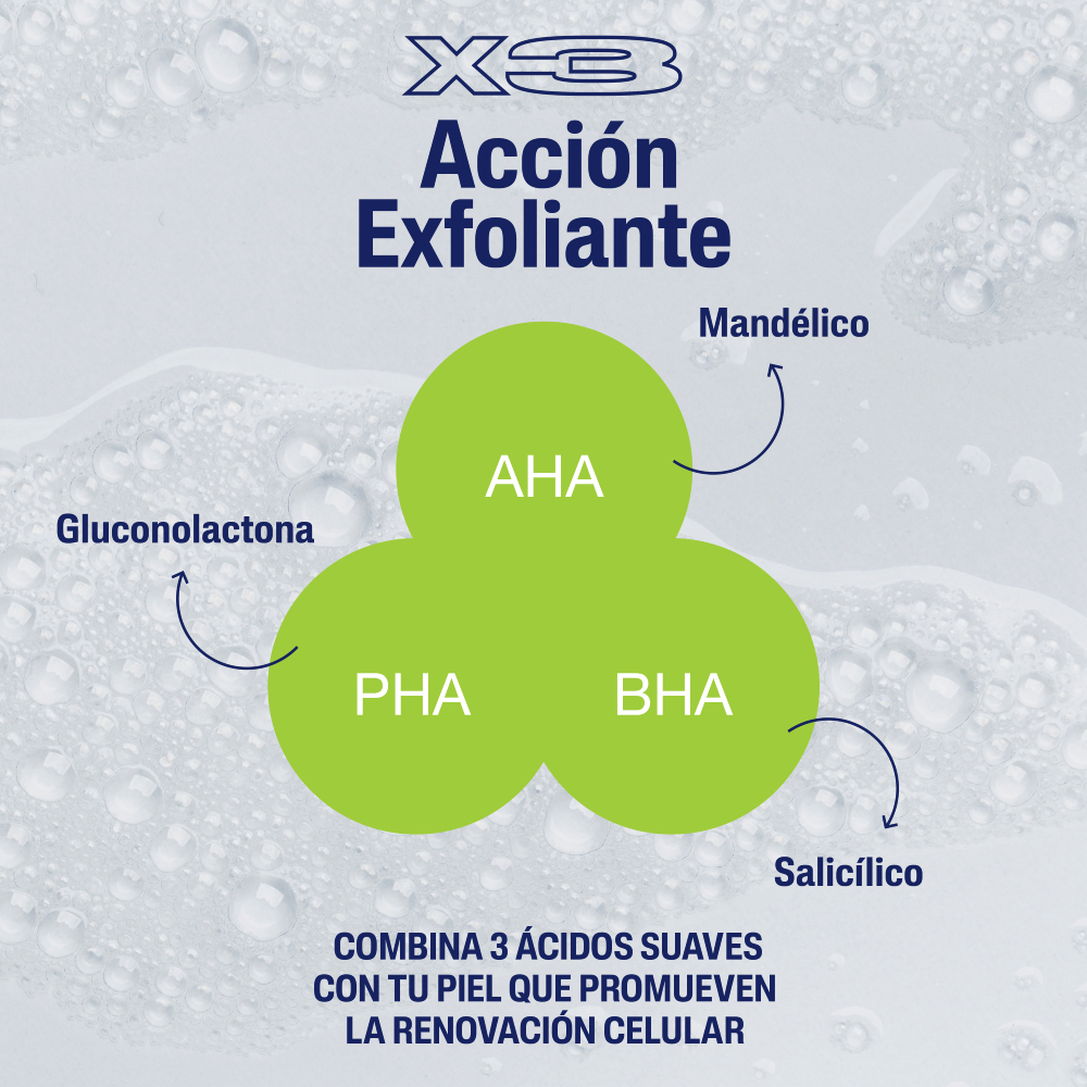 Este limpiador combina una poderosa mezcla de ácido salicílico (BHA), ácido mandélico (AHA) y gluconolactona (PHA), junto con ingredientes hidratantes como niacinamida, pantenol y glicerina, ofreciendo una limpieza profunda sin resecar ni irritar.