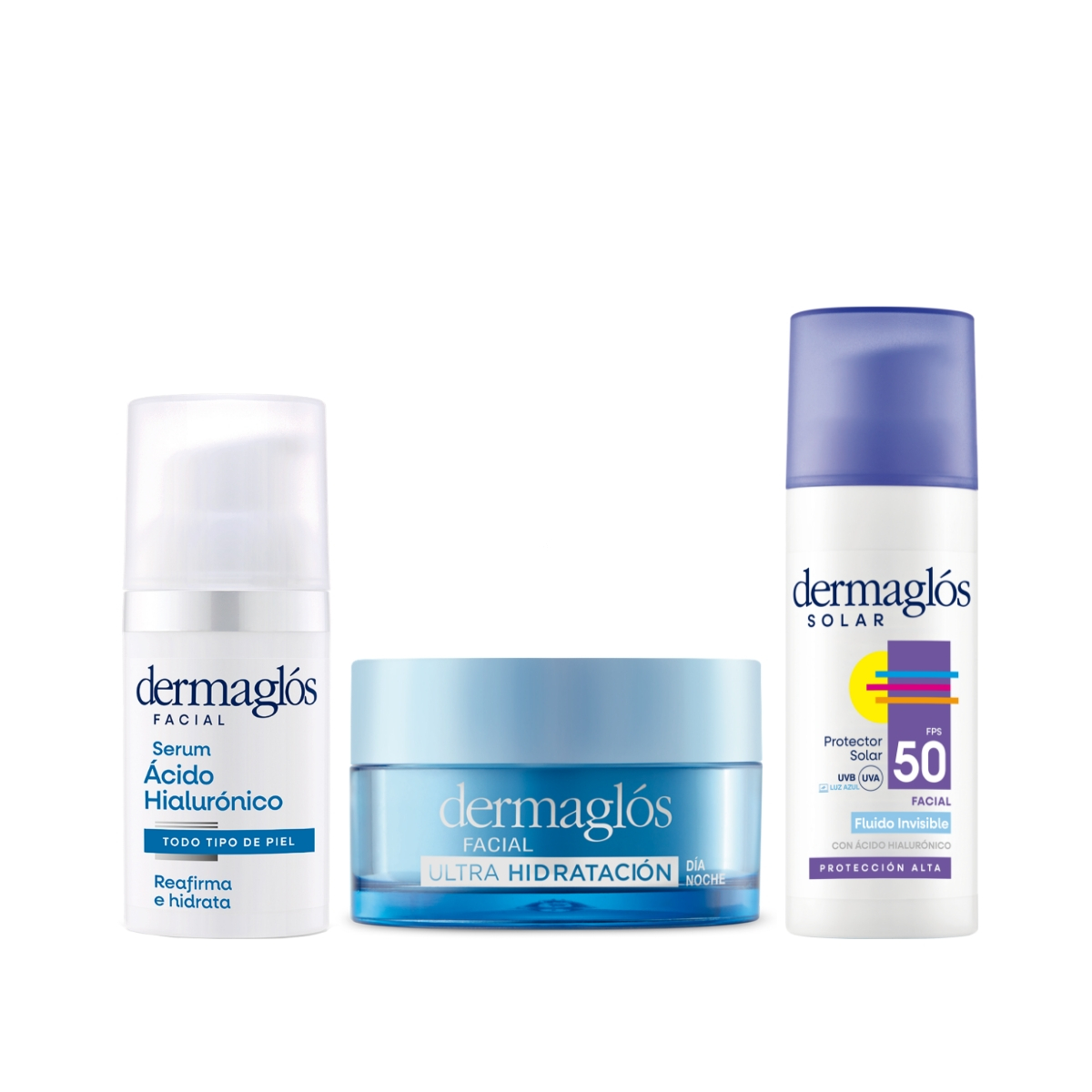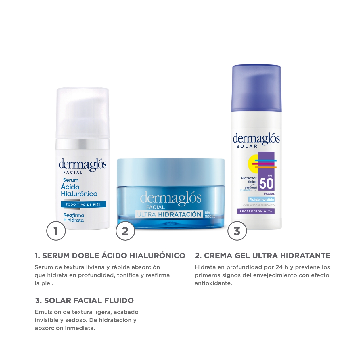 Se recomienda aplicar unas gotas del Sérum Ácido Hialurónico Dermaglós sobre la piel limpia y ligeramente húmeda, extendiendo con movimientos ascendentes. Luego, aplicar la Crema Gel Ultra Hidratación Día y Noche en rostro, cuello y escote, masajeando suavemente hasta absorción completa. Por la mañana, finalizar con el Protector Solar Fluido Fps50, aplicar generosamente 30 minutos antes de la exposición solar, reaplicar cada 2 horas o tras sudor o contacto con el agua.